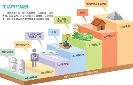 核電站醫(yī)院的放射科有電離輻射,我們生活中也有輻射。全世界的人的本底輻射劑量是2.4mSv/人,本底輻射:宇宙射線、天然放射性核素發(fā)出的射線、宇宙射線的強(qiáng)度隨海拔高度的增加而增大,高原地區(qū)的人群受到的宇宙射線照射劑量比平原地區(qū)的人群高,宇宙射線的強(qiáng)度在對流層上大約10公里處最強(qiáng)。需要我們指出的是:適當(dāng)?shù)奶烊挥行д丈鋵θ梭w是有益的。